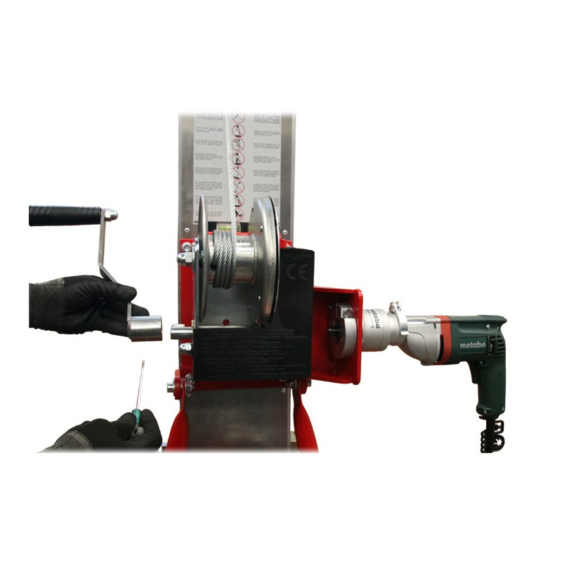 El conjunto está compuesto por un taladro METABO de 750 W de potencia y un adaptador para su fijación al cabrestante del elevador.