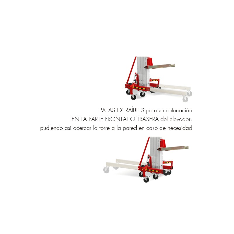 Nuestros elevadores tienen un diseño especial, que permite colocar las patas en su parte frontal o trasera, pudiendo así acercar la torre a la pared en caso de necesidad. Estas patas telescópicas están equipadas con ruedas con husillos niveladores. (Nota: Disponible bandeja y contrapesos)