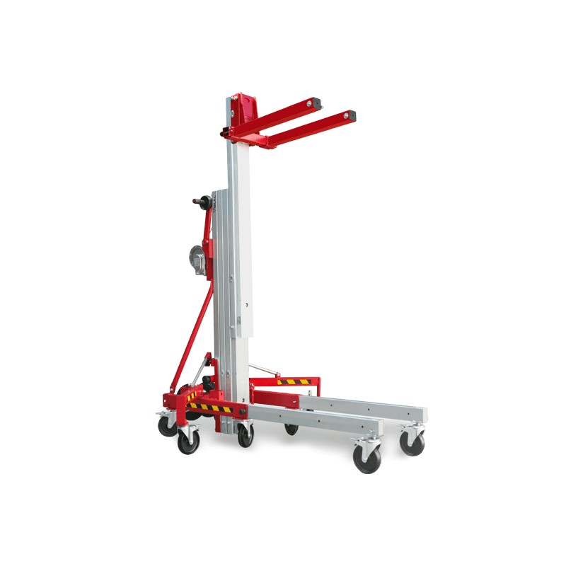 El Elevador de carga, provisto de 4 perfiles de aluminio extensibles mediante juegos de poleas, se suministra con todos los componentes y accesorios necesarios para su utilización: estabilizadores laterales con nivelador, horquillas, ruedas para su transporte en vertical y horizontal, etc.