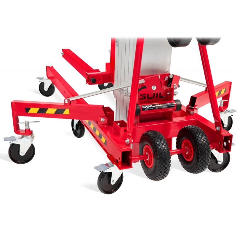 Nuestros elevadores tienen un diseño especial, que permite colocar las patas en su parte frontal o trasera, pudiendo así acercar la torre a la pared en caso de necesidad. Estas patas telescópicas están equipadas con ruedas con husillos niveladores. (Nota: Disponible bandeja y contrapesos)