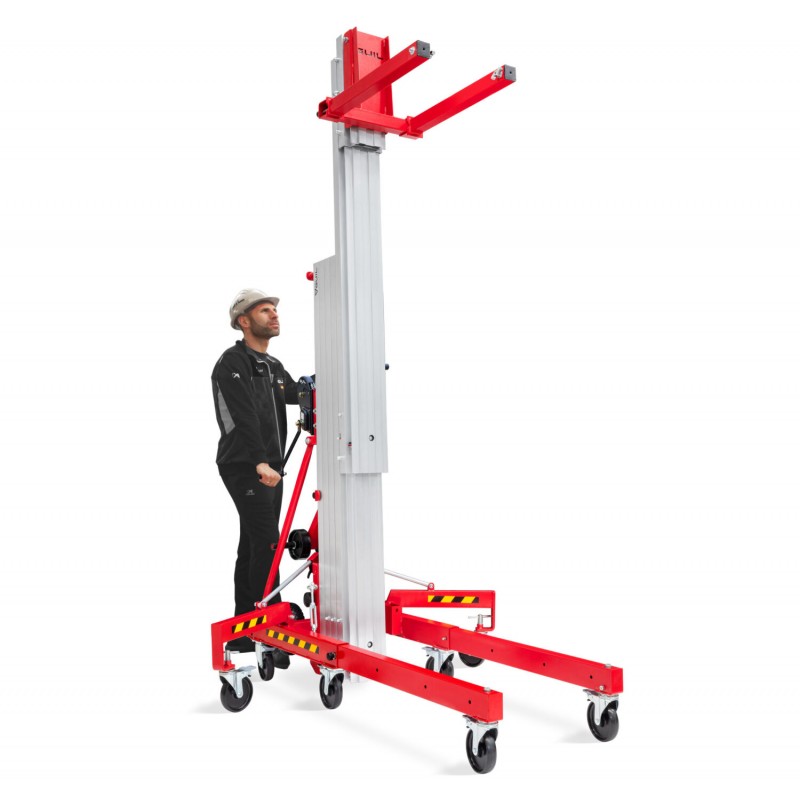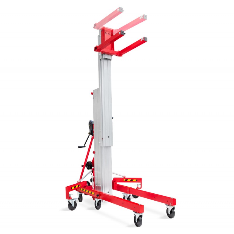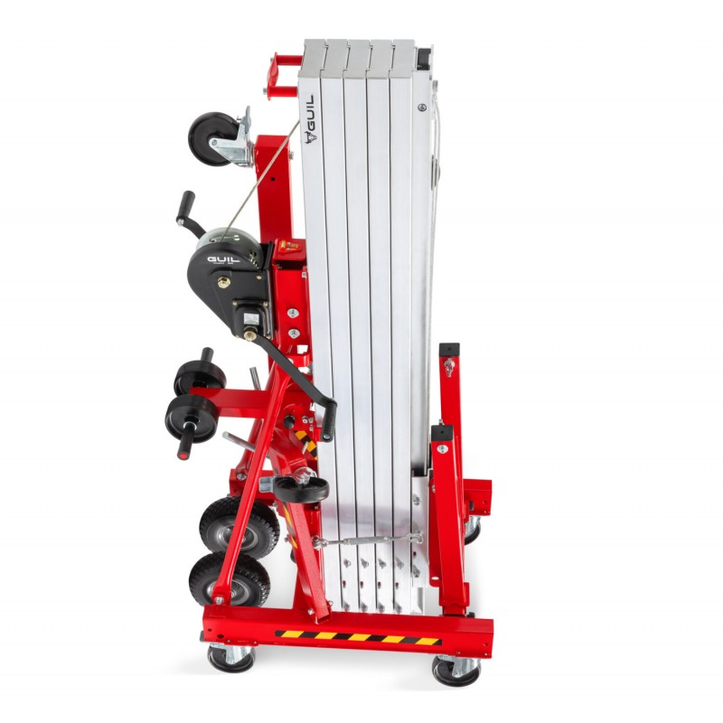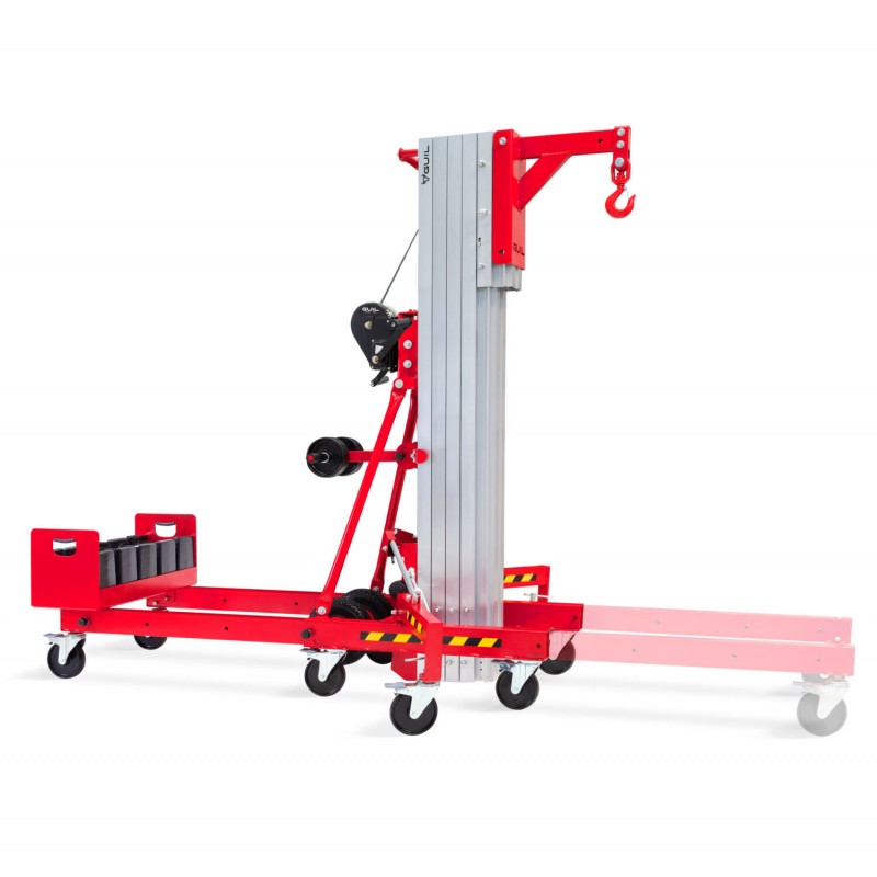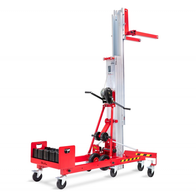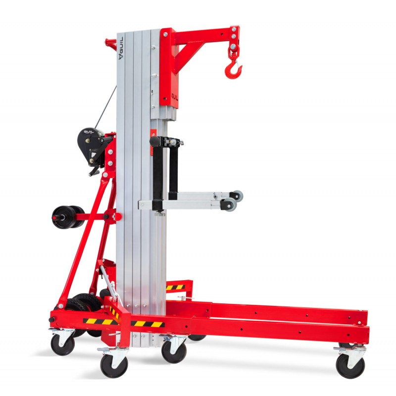 El Elevador de carga, provisto de 4 perfiles de aluminio extensibles mediante juegos de poleas, se suministra con todos los componentes y accesorios necesarios para su utilización: estabilizadores laterales con nivelador, horquillas, ruedas para su transporte en vertical y horizontal, etc.