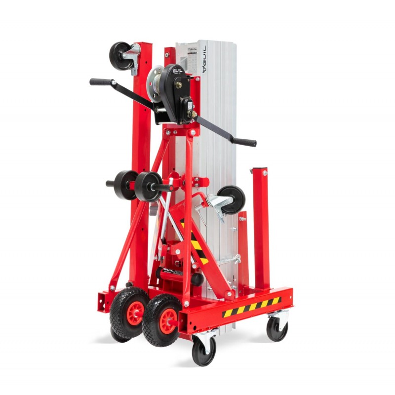 El Elevador de carga, provisto de 3 perfiles de aluminio extensibles mediante juegos de poleas, se suministra con todos los componentes y accesorios necesarios para su utilización: estabilizadores laterales con nivelador, horquillas, cabrestante de doble manivela, ruedas para su transporte en vertical y horizontal, etc.