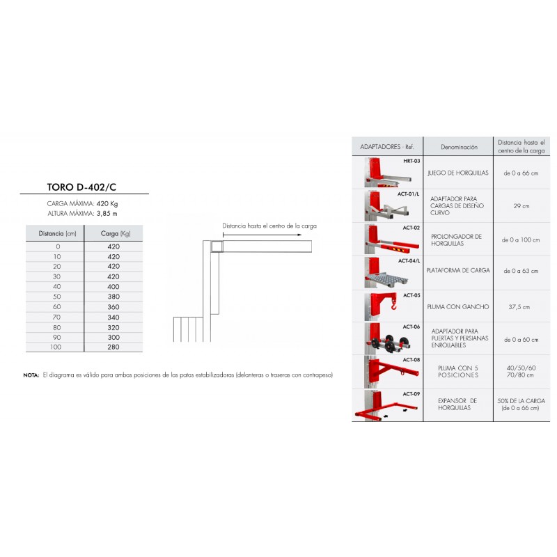 La amplia variedad de aplicaciones, su gran capacidad de carga y su fácil manejo, hacen del Elevador TORO D-402/C el elemento perfecto para cualquier tipo de trabajo.