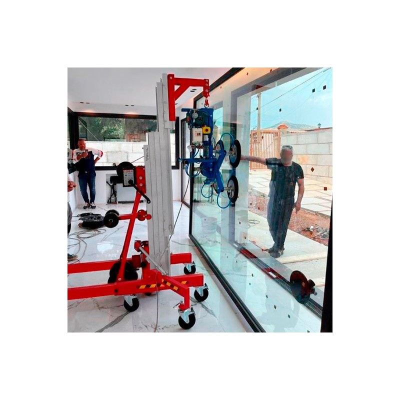 El Elevador TORO D-403/C provisto de 4 perfiles de aluminio extensibles mediante juegos de poleas, se suministra con todos los componentes y accesorios necesarios para su utilización: estabilizadores laterales con nivelador, horquillas, cabrestante de doble manivela, ruedas para su transporte en vertical y horizontal, etc.