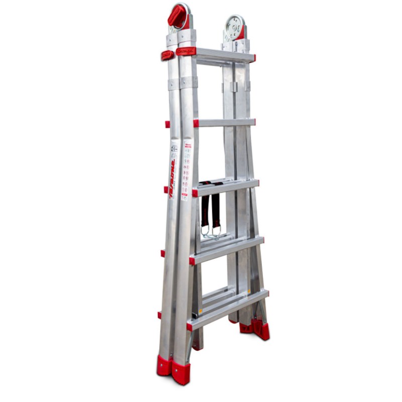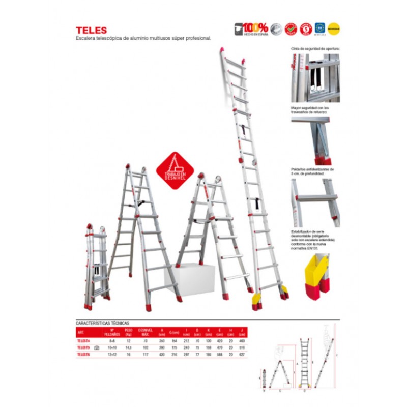 El modelo TELES está fabricado en aluminio, con peldaños de 3 cm, altura regulable y tacos de alta adherencia.