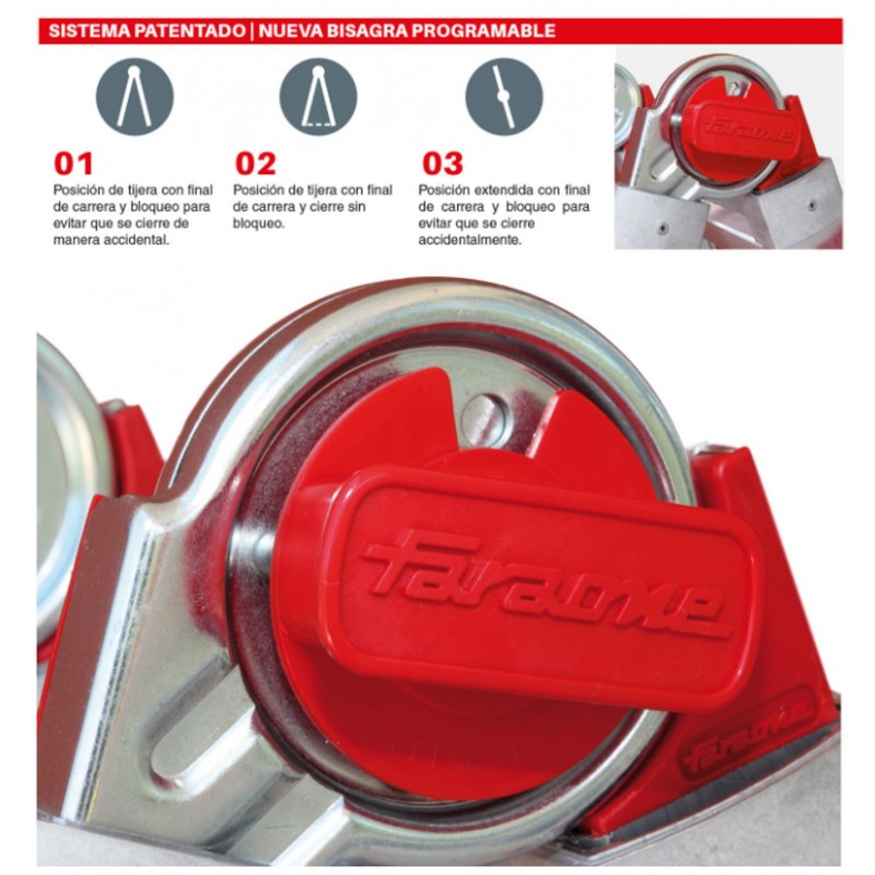 Puede emplearse tanto en posición auto-estable, en tijera, como extendida. Tiene un sistema de bisagras patentado que puede programarse para las dos posiciones que dispone el producto; con sistema de bloqueo para evitar el cierre de manera inesperada.
