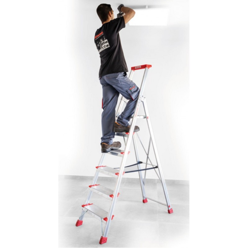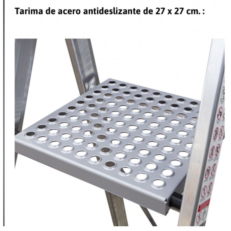 El modelo ELEGANCE está fabricado en aluminio, con montantes con perfiles estriados, peldaños de 13 cm. fijados con remaches de acero de gran resistencia, posee un sistema de refuerzos en zonas vulnerables que dotan al modelo de una gran estabilidad, tarima de acero antideslizante de 27x27 cm. y una amplia bandeja portaobjetos.