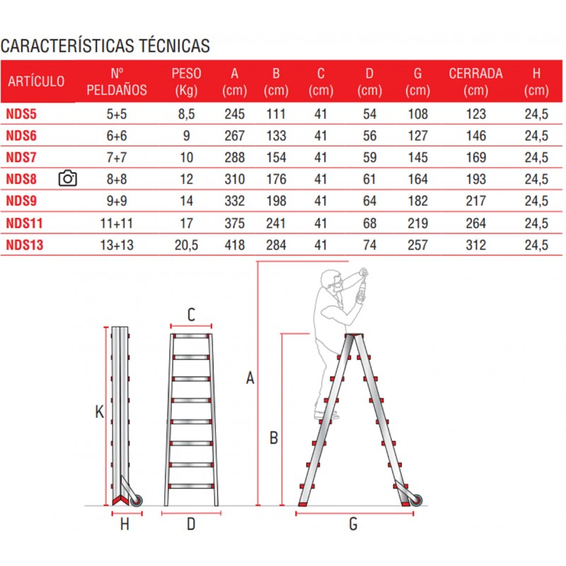 El modelo NDS está fabricado en aluminio, posee un sistema de bisagras rígido y resistente entre los dos tramos de subida, un sistema anti cierre seguro, peldaños de 13 cm y amplios tacos de goma con un buen agarre a la superficie. Cuenta con gran estabilidad con los travesaños de refuerzo en los ángulos y cadena de metal anti-apertura. Disponible desde 5 a 13 peldaños.