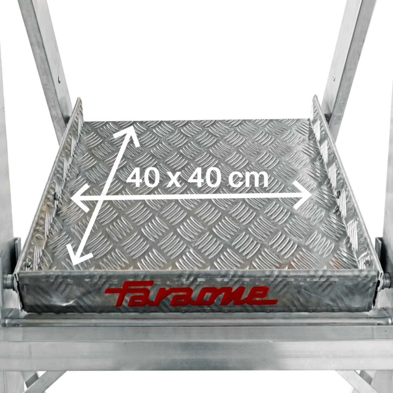 Escalera plegable profesional con plataforma de trabajo de 40x40 cm, peldaños antideslizantes de 8 cm y ruedas dobles. Compacta, resistente y fácil de transportar.