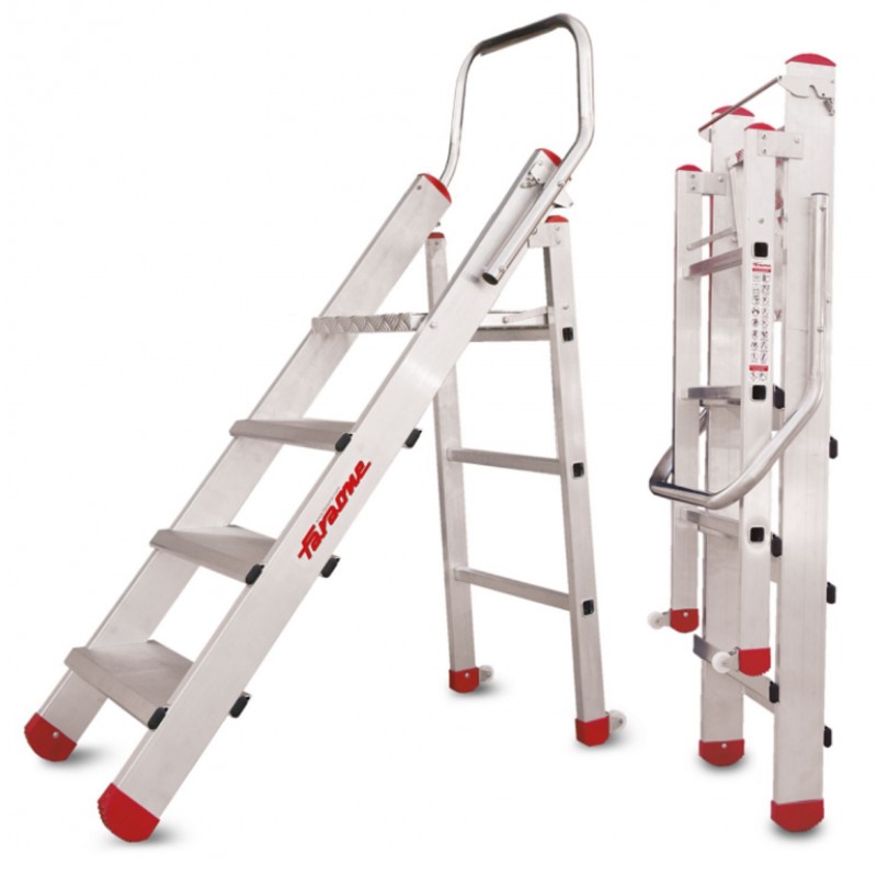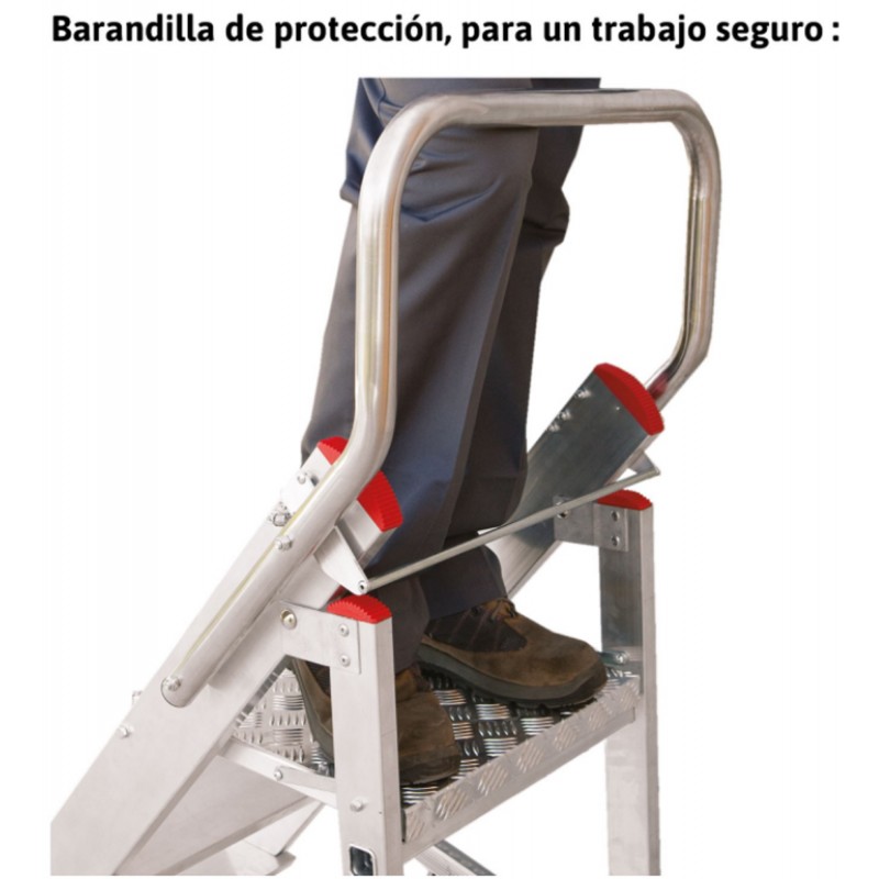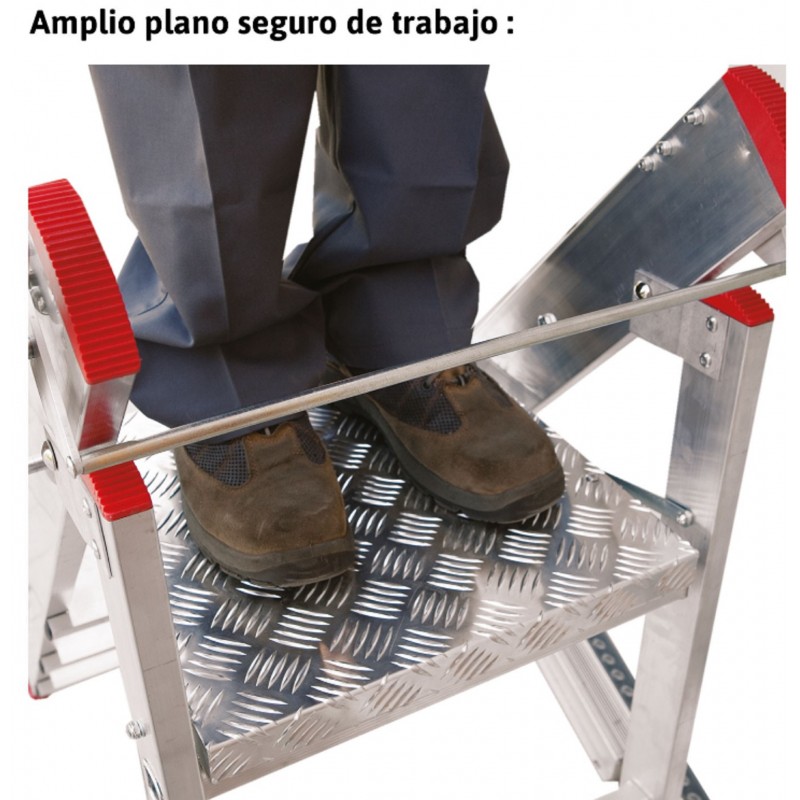 Taburete tipo cúpula, modelo de un peldaño, y un taburete tipo gradilla para el resto de modelos. Es un taburete de aluminio fabricado con peldaños antideslizantes de 18 cm para dotar de estabilidad y seguridad durante el uso. Además, lleva incorporadas, en la parte trasera un par de ruedas para un desplazamiento fácil y cómodo. La carga máxima que aguanta es de 150 kg.