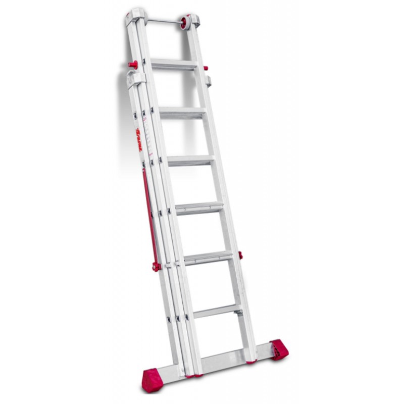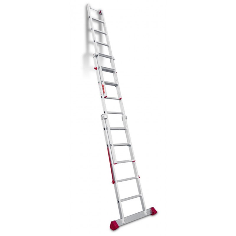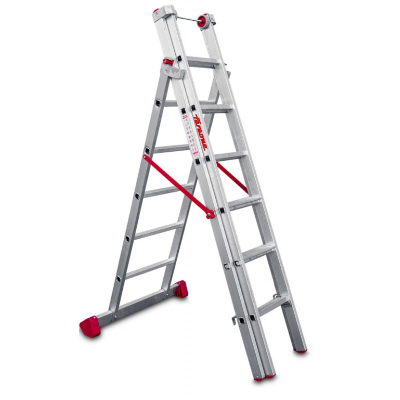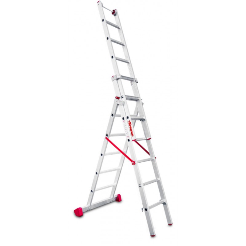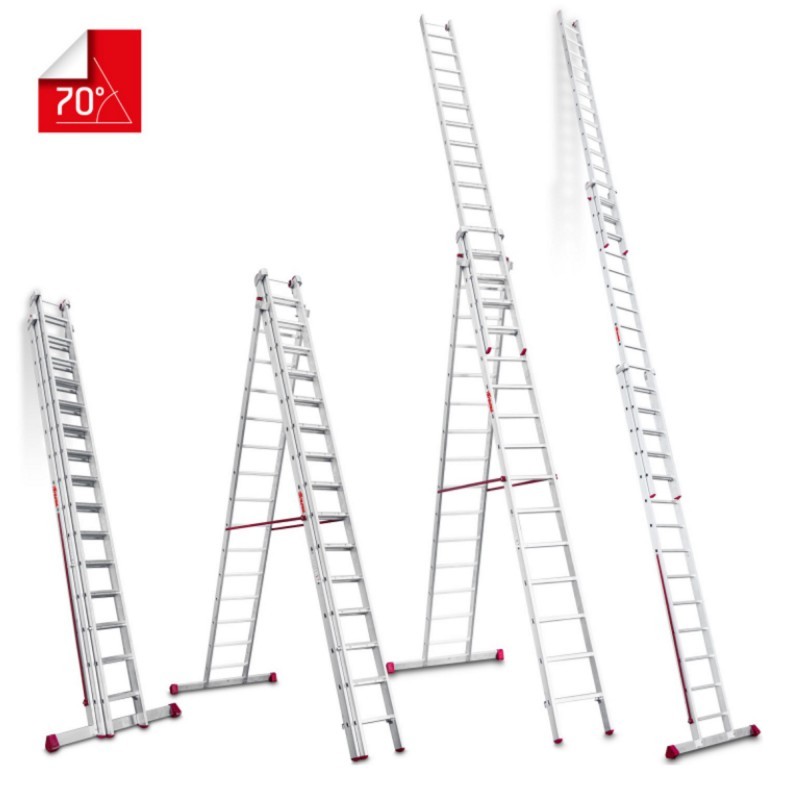 La EN1500 es una escalera de aluminio triple. Al ser una escalera multiusos combinada se puede utilizar como escalera de tijera de doble subida, los tres tramos se pueden extender y se puede usar como escalera de apoyo a pared, se puede poner en desnivel por lo cual es indicada para realizar tareas en suelos desnivelados como aceras o escaleras. Tiene los peldaños, del tramo anterior, antideslizantes con 8 cm de profundidad y la base estabilizadora con 2 tacos grandes de goma que le confiere mayor seguridad y agarre sobre todo en suelos de tierra que no estén correctamente nivelados. Dispone de 2 ruedas en la extremidad para facilitar la extensión a pared, bisagra robusta que permite de nivelar el tramo para trabajar en desnivel, un bloqueo de seguridad mediante un gancho con muelle practico y seguro.