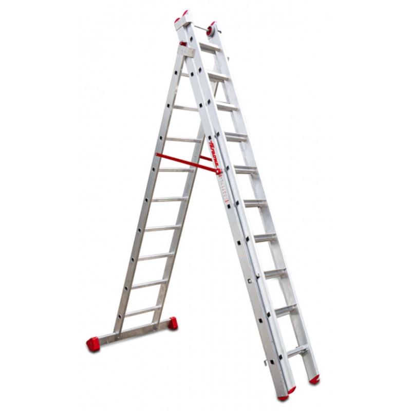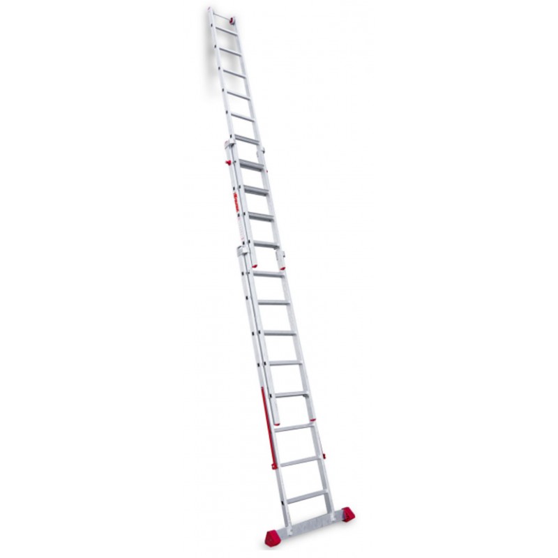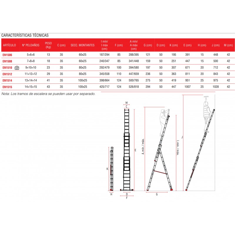 La EN1500 es una escalera de aluminio triple. Al ser una escalera multiusos combinada se puede utilizar como escalera de tijera de doble subida, los tres tramos se pueden extender y se puede usar como escalera de apoyo a pared, se puede poner en desnivel por lo cual es indicada para realizar tareas en suelos desnivelados como aceras o escaleras. Tiene los peldaños, del tramo anterior, antideslizantes con 8 cm de profundidad y la base estabilizadora con 2 tacos grandes de goma que le confiere mayor seguridad y agarre sobre todo en suelos de tierra que no estén correctamente nivelados. Dispone de 2 ruedas en la extremidad para facilitar la extensión a pared, bisagra robusta que permite de nivelar el tramo para trabajar en desnivel, un bloqueo de seguridad mediante un gancho con muelle practico y seguro.
