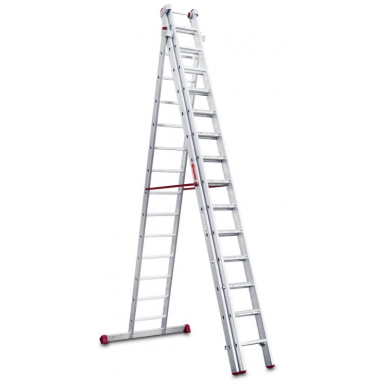 La EN1500 es una escalera de aluminio triple. Al ser una escalera multiusos combinada se puede utilizar como escalera de tijera de doble subida, los tres tramos se pueden extender y se puede usar como escalera de apoyo a pared, se puede poner en desnivel por lo cual es indicada para realizar tareas en suelos desnivelados como aceras o escaleras. Tiene los peldaños, del tramo anterior, antideslizantes con 8 cm de profundidad y la base estabilizadora con 2 tacos grandes de goma que le confiere mayor seguridad y agarre sobre todo en suelos de tierra que no estén correctamente nivelados. Dispone de 2 ruedas en la extremidad para facilitar la extensión a pared, bisagra robusta que permite de nivelar el tramo para trabajar en desnivel, un bloqueo de seguridad mediante un gancho con muelle practico y seguro.