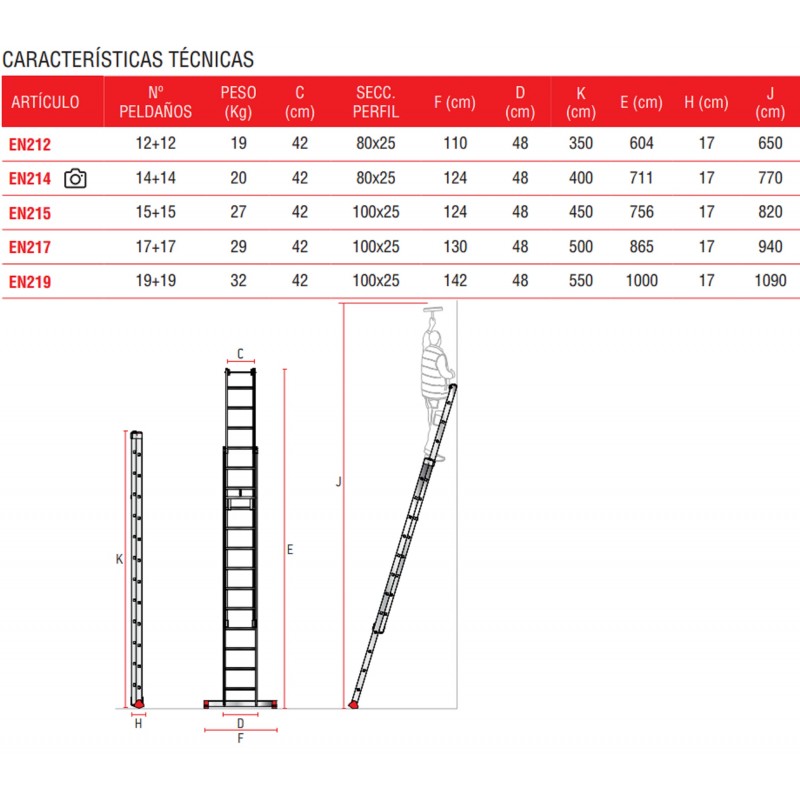 El modelo EN200 está fabricado en aluminio, con dos tramos que corren entre sí mediante un sistema de poleas accionado mediante cuerda, base estabilizadora con tacos de alta adherencia, par de ruedas superiores para asegurar apoyo y agarre a la pared y peldaños de 3 cm. Disponible en varias alturas y peldaños.