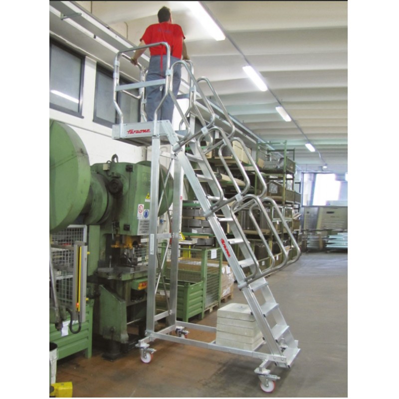 La SB60 es una escalera con vuelo y amplio plano de trabajo antideslizante con acceso mediante una escalera de 60º de inclinación con peldaños antideslizantes de 15 cm de profundidad y pasamanos en ambos lados. La escalera modelo SB60 está estudiada para trabajar en altura en sitios donde hay obstáculos en el suelo, por esto se fabrica con vuelos de diferentes largos, siendo el máximo 50 cm. El vuelo se puede posicionar tanto en el frente como en uno de los laterales del plano de trabajo. La estructura es ligera y robusta, y está enteramente fabricada de aluminio. El plano de trabajo incluye zócalos de 15 cm de altura y barandillas de seguridad de 110 cm en 3 lados. La escalera se desplaza mediante 4 ruedas de nylon de 12,5 cm de diámetro con freno. Este producto cumple con las normativas europea EN 131.7 y se entrega junto con el certificado de conformidad, la carga máxima que aguanta es de 150 kg.