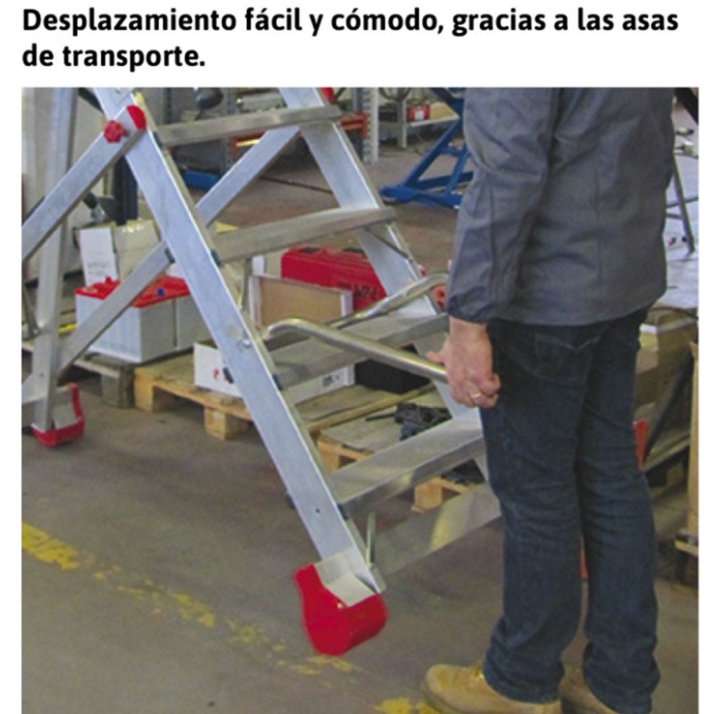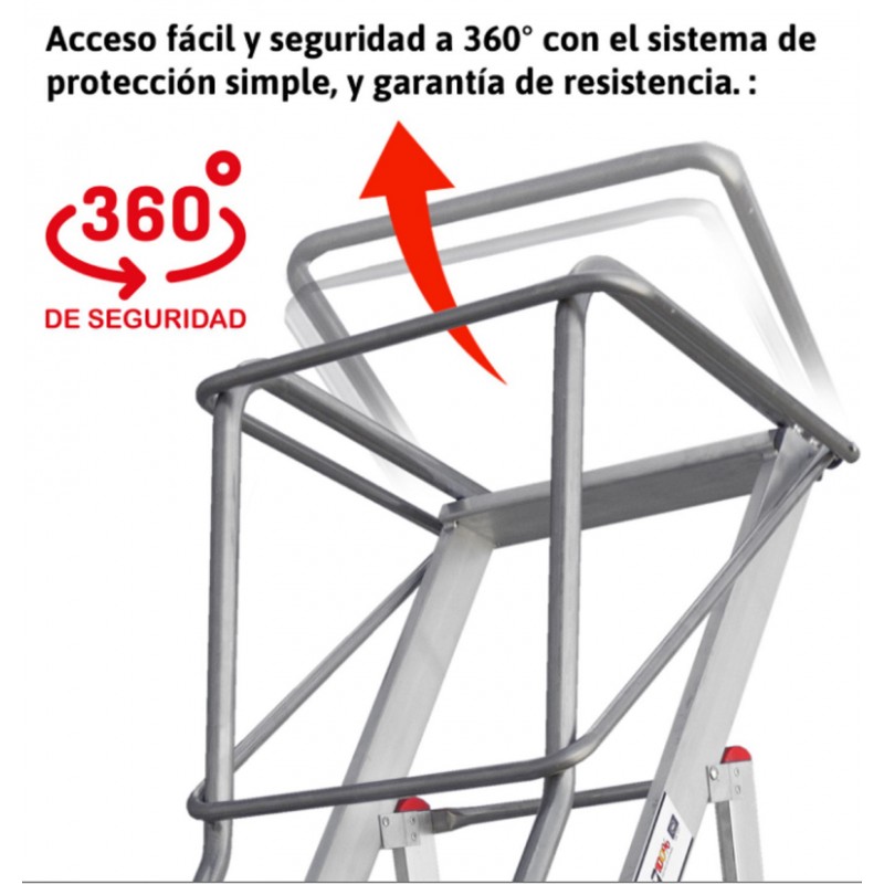 El plano de trabajo incluye zócalos de 15 cm de altura y barandillas de seguridad de 110 cm en los 4 lados, se accede a la plataforma levantando la barandilla. Dos bases estabilizadoras y dos ruedas de 17 cm de diámetro instaladas en la parte trasera. La escalera se desplaza mediante dos asas que permiten levantar la escalera para que las dos ruedas apoyen al suelo. Este producto cumple con la normativa europea EN 131-1,2,3 y se entrega junto con el certificado de conformidad, la carga máxima que aguanta es de 150 kg.