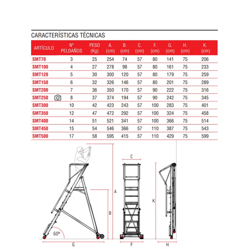 La SMT es una escalera plegable con ruedas y amplio plano de trabajo antideslizante de 52x62 cm con acceso mediante una escalera con 60º de inclinación con peldaños antideslizantes de 15 cm de profundidad y pasamanos en ambos lados. Estructura ligera y robusta enteramente fabricada de aluminio.