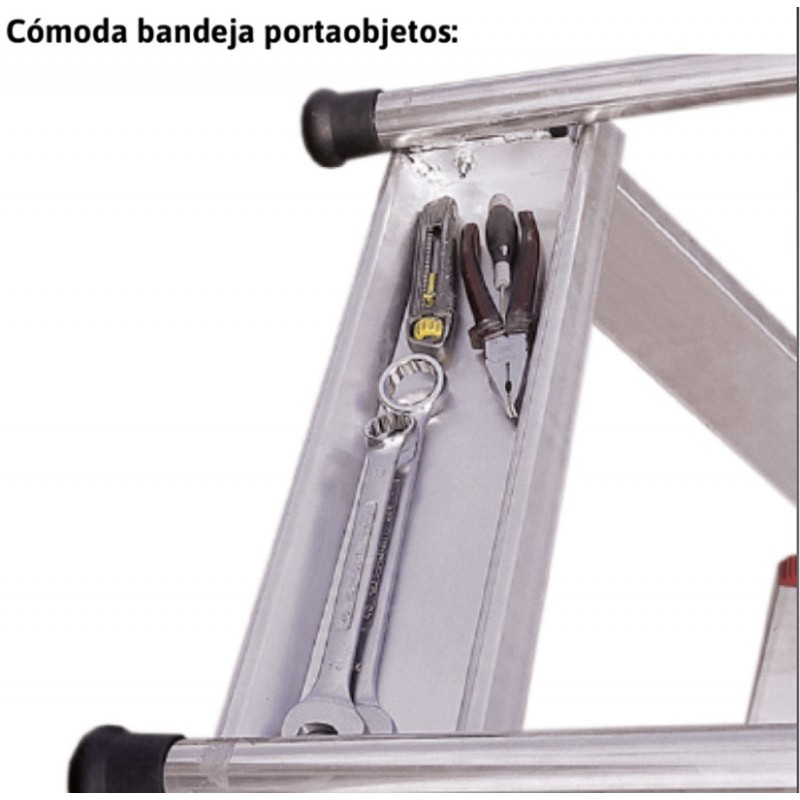 El plano de trabajo incluye zócalos de 15 cm de altura y barandillas de seguridad de 110 cm en los 4 lados, se accede a la plataforma levantando la barandilla. Dos bases estabilizadoras y dos ruedas de 17 cm de diámetro instaladas en la parte trasera. La escalera se desplaza mediante dos asas que permiten levantar la escalera para que las dos ruedas apoyen al suelo. Este producto cumple con la normativa europea EN 131-1,2,3 y se entrega junto con el certificado de conformidad, la carga máxima que aguanta es de 150 kg.