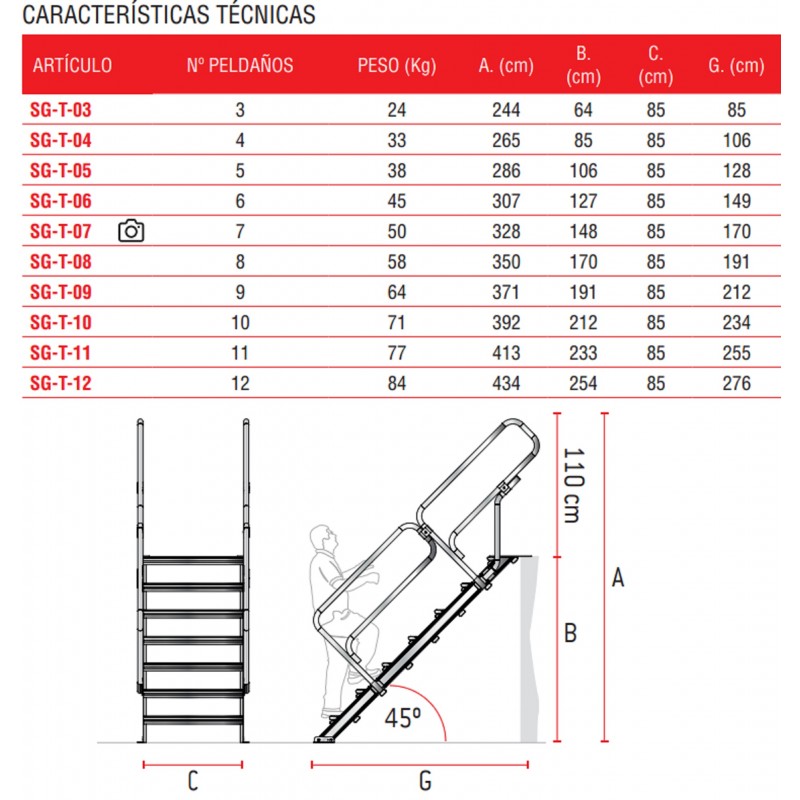| ARTÍCULO | Nº PELDAÑOS | PESO (Kg) | A.(Cm) | B.(Cm) | C.(Cm) | G.(Cm) |