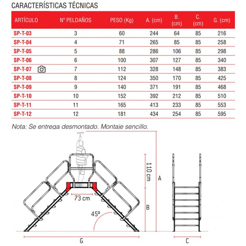 La SP-T es una escalera de doble subida con ruedas, amplio plano de trabajo antideslizante de 100x85 cm fabricado con rejilla electrosoldada (tramex), acceso mediante dos escalera de 45º de inclinación, peldaños antideslizantes de 27 cm de profundidad fabricado en tramex y pasamanos en ambos lados. Estructura ligera y robusta fabricada de aluminio y plataforma y peldaños de acero. La SP-T es una escalera generalmente utilizada en industrias envasadoras para facilitar el mantenimiento en maquinarias que se encuentren próximas a cintas transportadoras. El plano de trabajo incluye zócalos de 15 cm de altura y barandillas de seguridad de 110 cm en 3 lados. Dos bases zincadas con 4 ruedas de 12,5 cm de diámetro para su cómodo desplazamiento. Este producto cumple con la normativa europea EN 14122-3 y se entrega junto con el certificado de conformidad, la carga máxima que aguanta es de 150 kg.