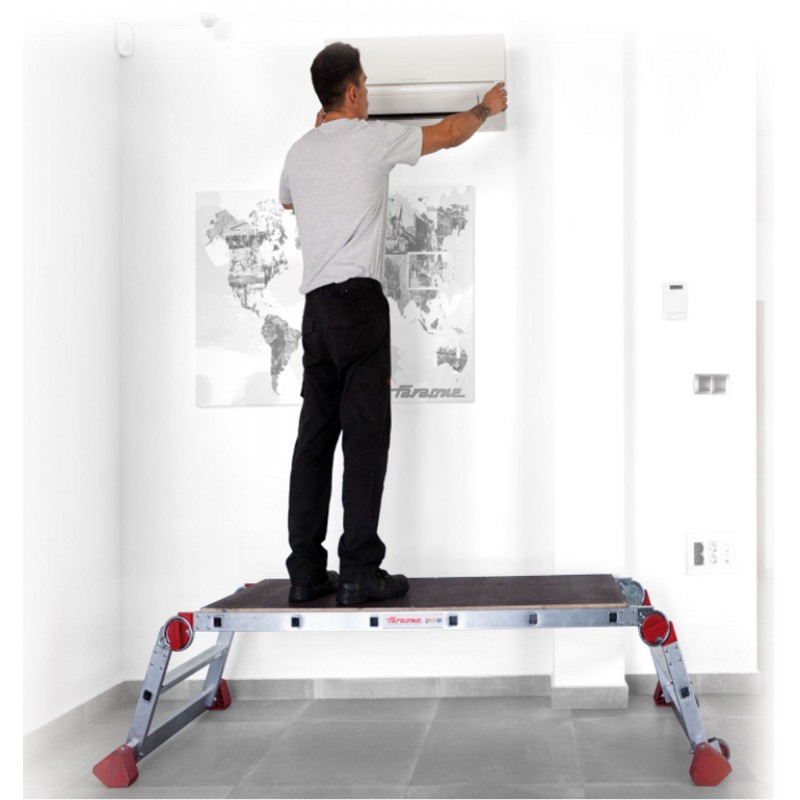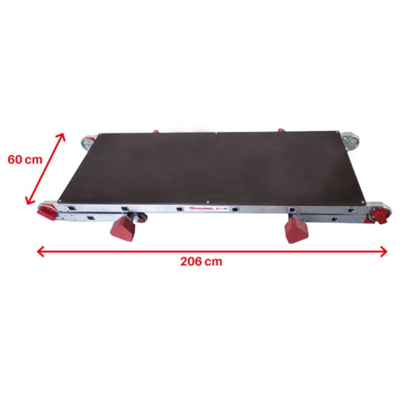 La PLA es una plataforma de trabajo plegable con ruedas y amplio plano de trabajo fabricado con una madera especial resistente al agua. El plano de trabajo mide 206 cm de largo por 60 cm de ancho. Se accede a la plataforma mediante una escalera con peldaños antideslizantes de 8 cm de profundidad. Estructura ligera y robusta fabricada en aluminio.