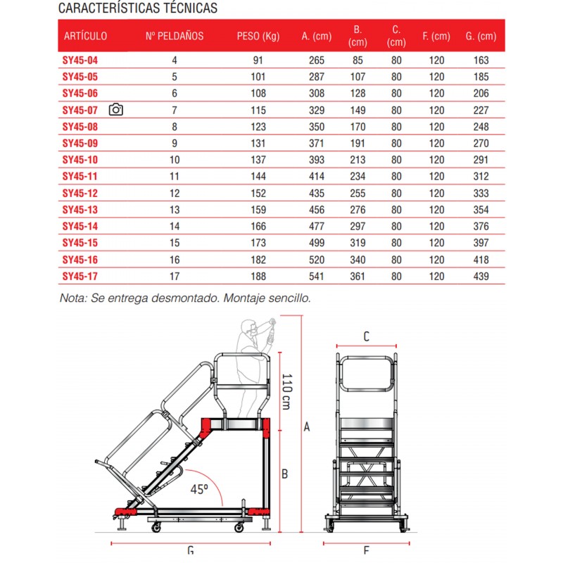 La SY45 es una escalera con ruedas y amplio plano de trabajo antideslizante de 80x100 cm con acceso mediante una escalera de 45º de inclinación con peldaños antideslizantes de 24 cm de profundidad y pasamanos en ambos lados. Estructura ligera y robusta enteramente fabricada de aluminio. La SY45 es una escalera generalmente utilizada en las industrias para almacenar material en las estanterías o para realizar mantenimiento a maquinarias. La parte trasera es vertical, esto permite aproximar la escalera a maquinarias, paredes verticales y estanterías. El plano de trabajo incluye zócalos de 24 cm de altura y barandillas de seguridad de 110 cm en 3 lados. Dos bases zincadas con 4 ruedas de 12,5 cm de diámetro para su cómodo desplazamiento. Este producto cumple con la normativa europea EN 131.7 y se entrega junto con el certificado de conformidad, la carga máxima que aguanta es de 150 kg.