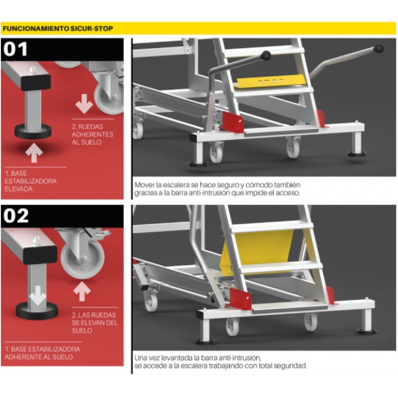 La SY45 es una escalera con ruedas y amplio plano de trabajo antideslizante de 80x100 cm con acceso mediante una escalera de 45º de inclinación con peldaños antideslizantes de 24 cm de profundidad y pasamanos en ambos lados. Estructura ligera y robusta enteramente fabricada de aluminio. La SY45 es una escalera generalmente utilizada en las industrias para almacenar material en las estanterías o para realizar mantenimiento a maquinarias. La parte trasera es vertical, esto permite aproximar la escalera a maquinarias, paredes verticales y estanterías. El plano de trabajo incluye zócalos de 24 cm de altura y barandillas de seguridad de 110 cm en 3 lados. Dos bases zincadas con 4 ruedas de 12,5 cm de diámetro para su cómodo desplazamiento. Este producto cumple con la normativa europea EN 131.7 y se entrega junto con el certificado de conformidad, la carga máxima que aguanta es de 150 kg.