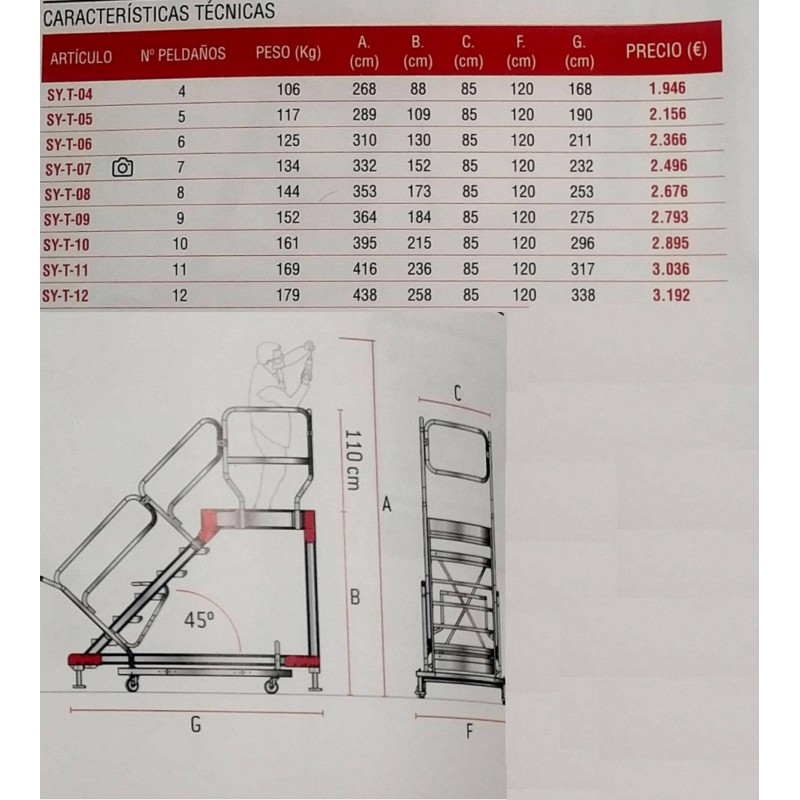 La SY-T es una escalera con ruedas y amplio plano de trabajo antideslizante de 85x100 cm con acceso mediante una escalera de 45º de inclinación con peldaños antideslizantes de 27 cm de profundidad y pasamanos en ambos lados. Estructura ligera y robusta enteramente fabricada de aluminio. La SY-T es una escalera generalmente utilizada en las industrias para almacenar material en las estanterías o para realizar mantenimiento a maquinarias. La parte trasera es vertical, esto permite aproximar la escalera a maquinarias, paredes verticales y estanterías. El plano de trabajo incluye zócalos de 24 cm de altura y barandillas de seguridad de 110 cm en 3 lados. Dos bases zincadas con 4 ruedas de 12,5 cm de diámetro para su cómodo desplazamiento. Este producto cumple con la normativa europea EN 131.7 y se entrega junto con el certificado de conformidad, la carga máxima que aguanta es de 150 kg.