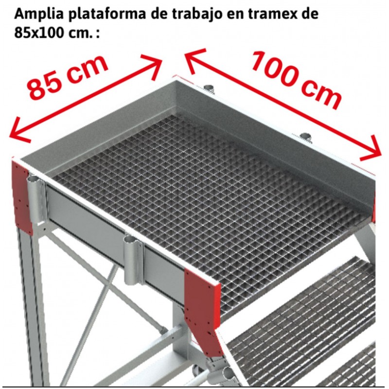 Escalera con plataforma de tramex, base con ruedas, peldaños de tramex 27 cm. y 45º de inclinación: