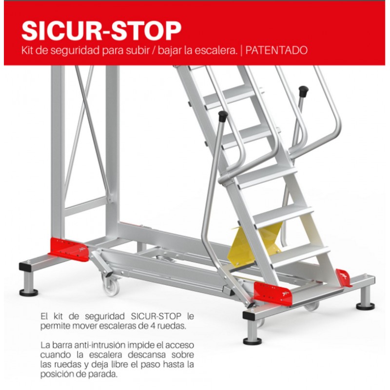 La SY-T es una escalera con ruedas y amplio plano de trabajo antideslizante de 85x100 cm con acceso mediante una escalera de 45º de inclinación con peldaños antideslizantes de 27 cm de profundidad y pasamanos en ambos lados. Estructura ligera y robusta enteramente fabricada de aluminio. La SY-T es una escalera generalmente utilizada en las industrias para almacenar material en las estanterías o para realizar mantenimiento a maquinarias. La parte trasera es vertical, esto permite aproximar la escalera a maquinarias, paredes verticales y estanterías. El plano de trabajo incluye zócalos de 24 cm de altura y barandillas de seguridad de 110 cm en 3 lados. Dos bases zincadas con 4 ruedas de 12,5 cm de diámetro para su cómodo desplazamiento. Este producto cumple con la normativa europea EN 131.7 y se entrega junto con el certificado de conformidad, la carga máxima que aguanta es de 150 kg.