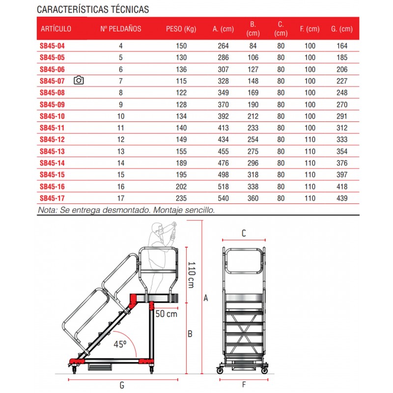 La SB45 es una escalera con vuelo y amplio plano de trabajo antideslizante con acceso mediante una escalera de 45º de inclinación con peldaños antideslizantes de 24 cm de profundidad y pasamanos en ambos lados. La escalera modelo SB45 está estudiada para trabajar en altura en sitios donde hay obstáculos en el suelo, por esto se fabrica con vuelos de diferentes largos, siendo el máximo 50 cm. El vuelo se puede posicionar tanto en el frente como en uno de los laterales del plano de trabajo. La estructura es ligera y robusta, y está enteramente fabricada de aluminio. El plano de trabajo incluye zócalos de 15 cm de altura y barandillas de seguridad de 110 cm en 3 lados. La escalera se desplaza mediante 4 ruedas de nylon de 12,5 cm de diámetro con freno. Este producto cumple con las normativas europea EN 131.7 y se entrega junto con el certificado de conformidad, la carga máxima que aguanta es de 150 kg.