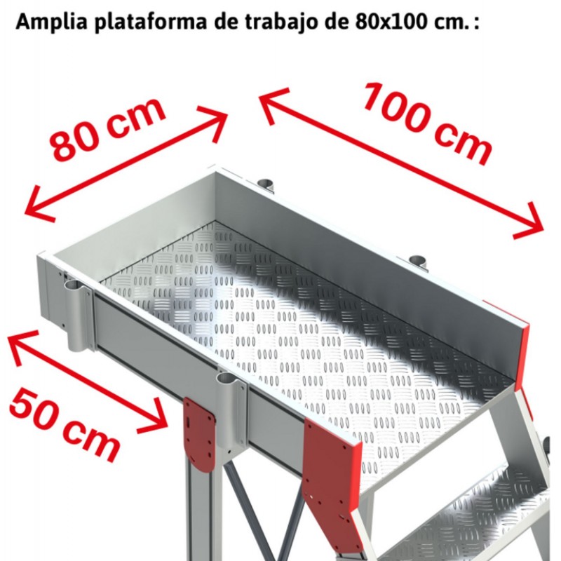 La SB45 es una escalera con vuelo y amplio plano de trabajo antideslizante con acceso mediante una escalera de 45º de inclinación con peldaños antideslizantes de 24 cm de profundidad y pasamanos en ambos lados. La escalera modelo SB45 está estudiada para trabajar en altura en sitios donde hay obstáculos en el suelo, por esto se fabrica con vuelos de diferentes largos, siendo el máximo 50 cm. El vuelo se puede posicionar tanto en el frente como en uno de los laterales del plano de trabajo. La estructura es ligera y robusta, y está enteramente fabricada de aluminio. El plano de trabajo incluye zócalos de 15 cm de altura y barandillas de seguridad de 110 cm en 3 lados. La escalera se desplaza mediante 4 ruedas de nylon de 12,5 cm de diámetro con freno. Este producto cumple con las normativas europea EN 131.7 y se entrega junto con el certificado de conformidad, la carga máxima que aguanta es de 150 kg.