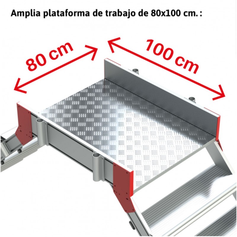 La SP45 es una escalera de doble subida con ruedas, amplio plano de trabajo antideslizante de 100x80 cm fabricado con rejilla electrosoldada, acceso mediante dos escalera de 45º de inclinación, peldaños antideslizantes de 27 cm de profundidad fabricado y pasamanos en ambos lados. Estructura ligera y robusta fabricada de aluminio y plataforma y peldaños de acero. La SP45 es una escalera generalmente utilizada en industrias envasadoras para facilitar el mantenimiento en maquinarias que se encuentren próximas a cintas transportadoras. El plano de trabajo incluye zócalos de 15 cm de altura y barandillas de seguridad de 110 cm en 3 lados. Dos bases zincadas con 4 ruedas de 12,5 cm de diámetro para su cómodo desplazamiento. Este producto cumple con la normativa europea EN 14122-3 y se entrega junto con el certificado de conformidad, la carga máxima que aguanta es de 150 kg.