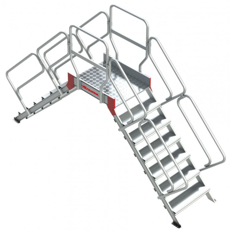 Escalera de doble ascenso con plataforma,base con ruedas y tramo de ascenso a 45º. SP45-14 14 Peldaños