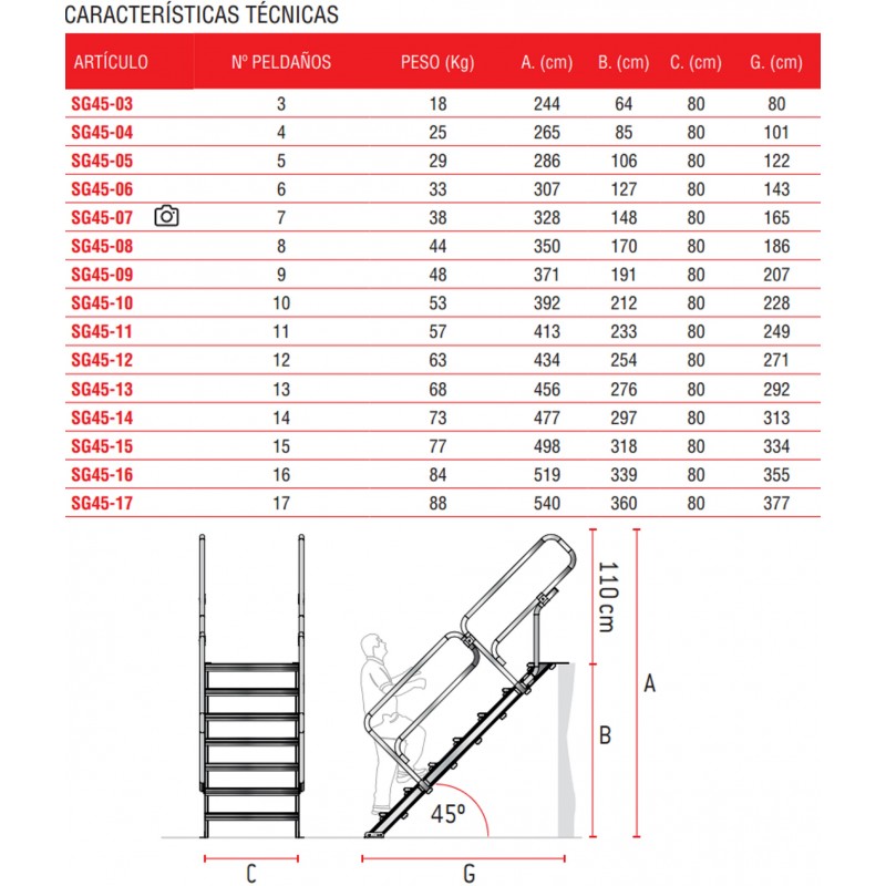 | ARTÍCULO | Nº PELDAÑOS | PESO(Kg) | A.(Cm) | B.(Cm) | C.(Cm) | G.(Cm) |