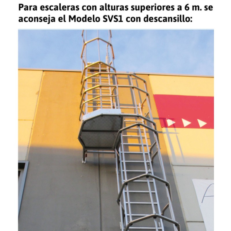 La SVS.2 es una escalera vertical de seguridad con jaula de protección y barandilla para desembarcar en total seguridad. Tanto la escalera como la jaula están fabricados en aluminio en cuanto no se oxida con el agua. Se suministra completa de cierre inferior de seguridad que evita el acceso a personal no autorizado, soportes con pletinas que sirven para la fijación a pared y barandilla de seguridad de 112 cm de altura que sobresale para desembarcar desde la escalera al techo de la nave en total seguridad. La escalera vertical con jaula modelo SVS.2 se fabrica según la altura de pared facilitada por el cliente y opcionalmente se puede pedir con la jaula de protección lacada de cualquier color. Como opcional se puede pedir con el primer tramo de escalera desmontable. Este producto cumple con la normativa europea EN 14122-4 y se entrega junto con el certificado de conformidad, la carga máxima que aguanta es de 150 kg.