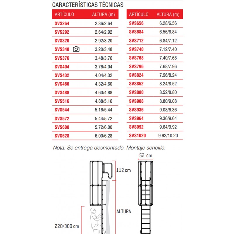 La SVS.2 es una escalera vertical de seguridad con jaula de protección y barandilla para desembarcar en total seguridad. Tanto la escalera como la jaula están fabricados en aluminio en cuanto no se oxida con el agua. Se suministra completa de cierre inferior de seguridad que evita el acceso a personal no autorizado, soportes con pletinas que sirven para la fijación a pared y barandilla de seguridad de 112 cm de altura que sobresale para desembarcar desde la escalera al techo de la nave en total seguridad. La escalera vertical con jaula modelo SVS.2 se fabrica según la altura de pared facilitada por el cliente y opcionalmente se puede pedir con la jaula de protección lacada de cualquier color. Como opcional se puede pedir con el primer tramo de escalera desmontable. Este producto cumple con la normativa europea EN 14122-4 y se entrega junto con el certificado de conformidad, la carga máxima que aguanta es de 150 kg.