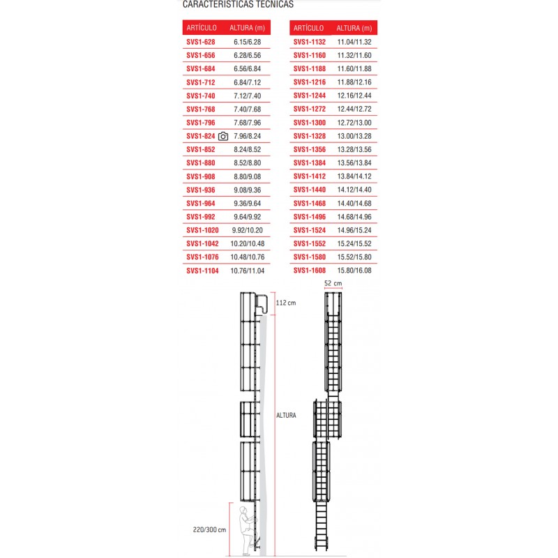La SVS1 es una escalera vertical de seguridad o escalera “de gato” con jaula de protección y plataformas que actúan de descansillo posicionadas cada 6 metros según establecido por la normativa EN 14122-4. Tanto la escalera como la jaula están fabricados en aluminio en cuanto no se oxida con el agua. Se suministra completa de cierre inferior de seguridad que evita el acceso a personal no autorizado, soportes con pletinas que sirven para la fijación a pared y barandilla de seguridad de 112 cm. de altura que sobresale para desembarcar desde la escalera al techo de la nave en total seguridad. La escalera vertical con jaula modelo SVS1 se fabrica según la altura de pared facilitada por el cliente y como opcional se puede pedir con la jaula de protección pintada de un color diferente al del aluminio y siempre como opcional se puede pedir con el primer tramo de escalera desmontable. Este producto cumple con la normativa europea EN 14122-4 y se entrega junto con el certificado de conformidad, la carga máxima que aguanta es de 150 kg.