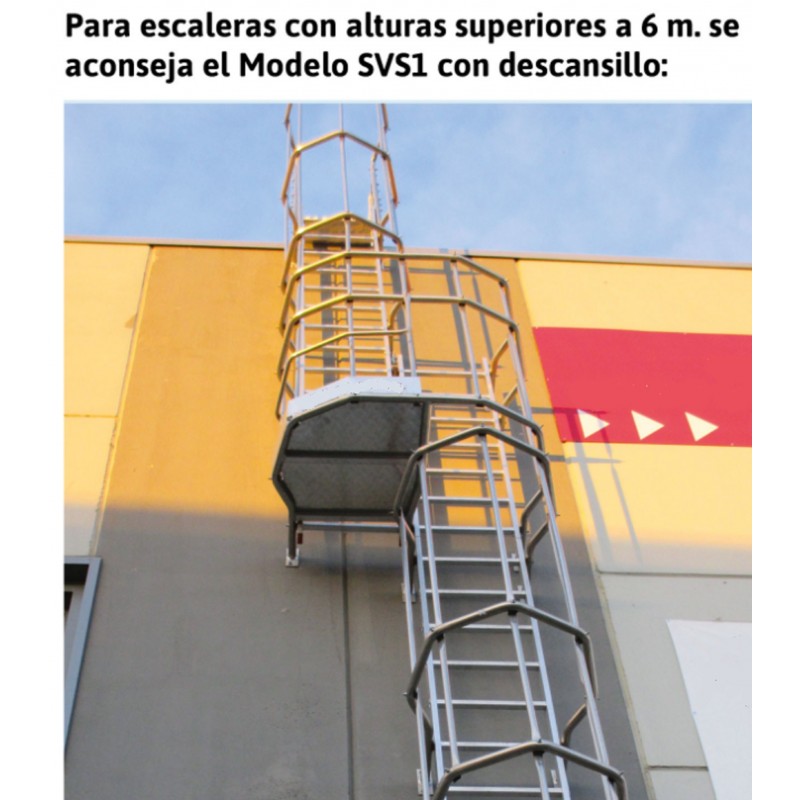 La SVS1 es una escalera vertical de seguridad o escalera “de gato” con jaula de protección y plataformas que actúan de descansillo posicionadas cada 6 metros según establecido por la normativa EN 14122-4. Tanto la escalera como la jaula están fabricados en aluminio en cuanto no se oxida con el agua. Se suministra completa de cierre inferior de seguridad que evita el acceso a personal no autorizado, soportes con pletinas que sirven para la fijación a pared y barandilla de seguridad de 112 cm. de altura que sobresale para desembarcar desde la escalera al techo de la nave en total seguridad. La escalera vertical con jaula modelo SVS1 se fabrica según la altura de pared facilitada por el cliente y como opcional se puede pedir con la jaula de protección pintada de un color diferente al del aluminio y siempre como opcional se puede pedir con el primer tramo de escalera desmontable. Este producto cumple con la normativa europea EN 14122-4 y se entrega junto con el certificado de conformidad, la carga máxima que aguanta es de 150 kg.
