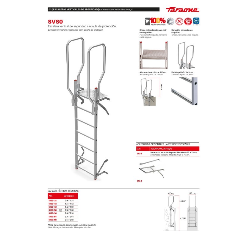 La escalera vertical modelo SVS0 se fabrica según la altura de la pared facilitada por el cliente. Este producto cumple con la normativa europea EN 14122-4 y se entrega junto con el certificado de conformidad. La carga máxima que aguanta es de 150 kg.
