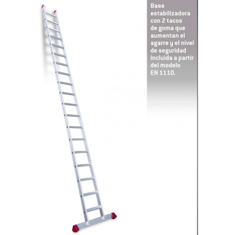 La EN1100 es una escalera de aluminio para uso en apoyo. Tiene los peldaños antideslizantes con 8 cm de profundidad y la base estabilizadora con 2 tacos de goma que le confiere mayor seguridad y asegura el cumplimiento de las actuales normativas europea EN 131-1,2,3. Este producto se entrega junto con el certificado de conformidad y el manual de instrucciones. La carga máxima que aguanta es de 150 kg.