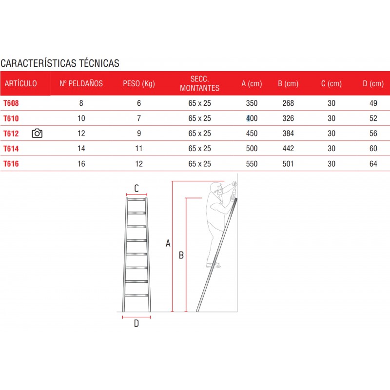 | ARTÍCULO | Nº PELDAÑOS | PESO(Kg) | SECC.MONTANTES | A(cm) | B.(cm) | C.(cm) | D.(cm) |