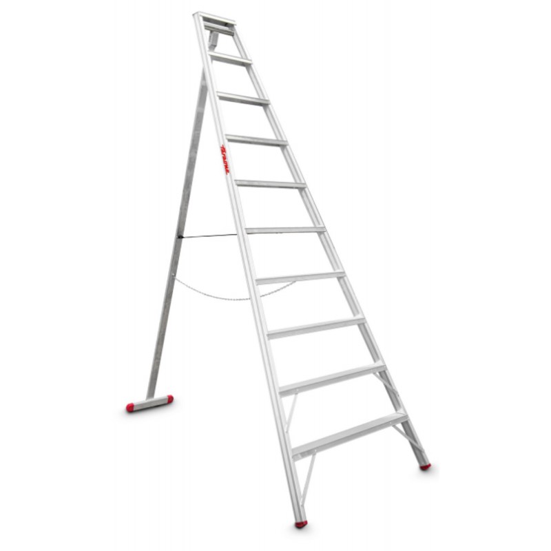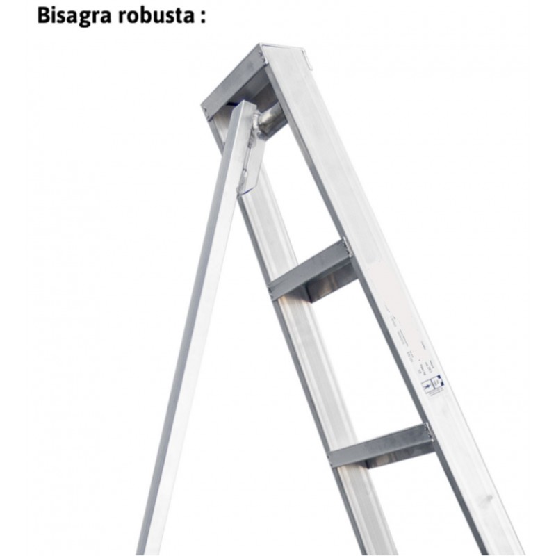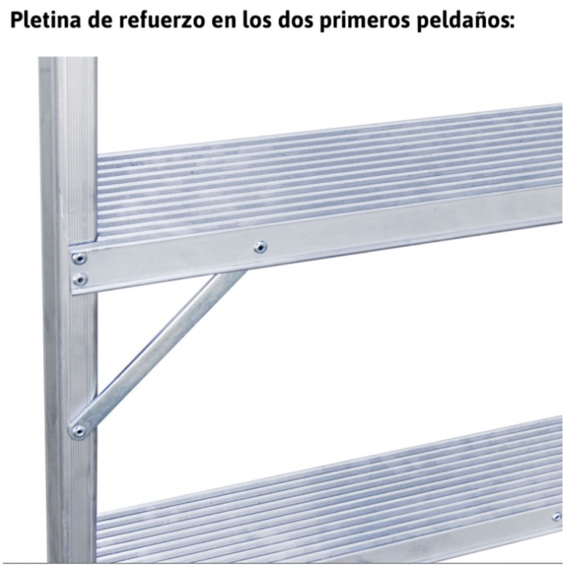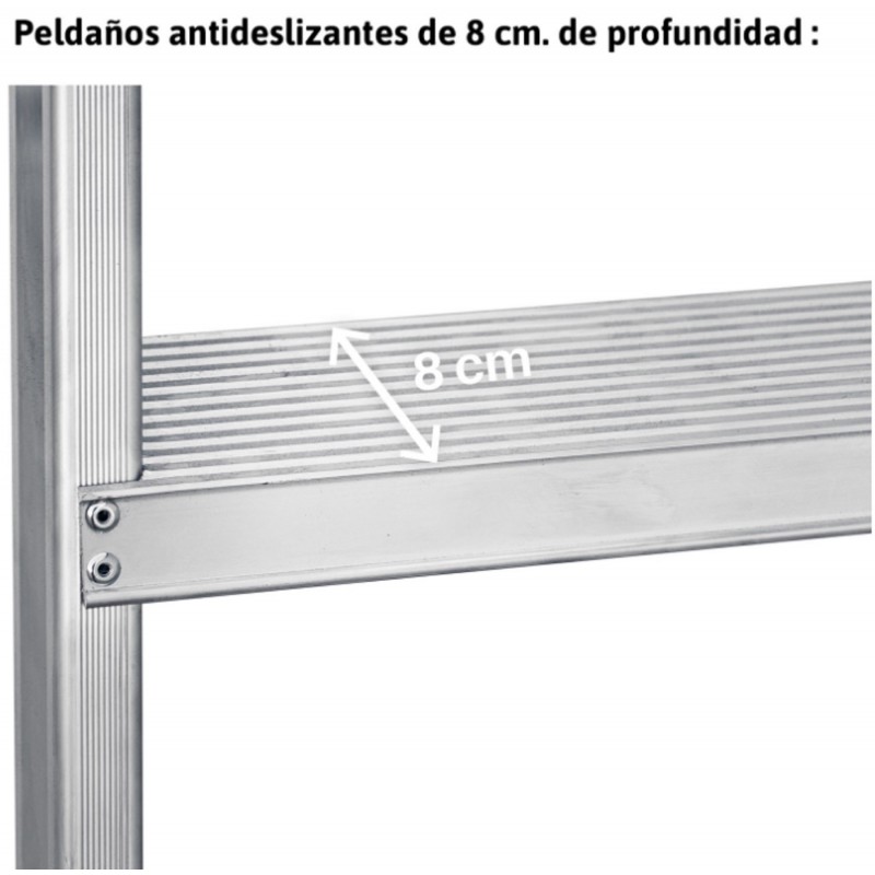 El modelo T700 está preparado para trabajar sobre terrenos arenosos o irregulares, con peldaños especiales antideslizantes de 8 cm de profundidad, tramo cónico con estabilizador frontal articulado, tacos antideslizantes y pinchos opcionales para fijar la escalera al terreno. Este producto se entrega junto con el certificado de conformidad y el manual de instrucciones, la carga máxima que aguanta es de 150 kg.