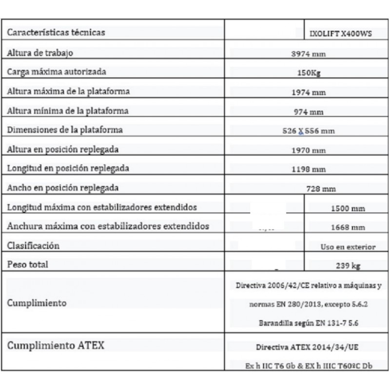 | Características técnicas | IXOLIFT X400WS | |
