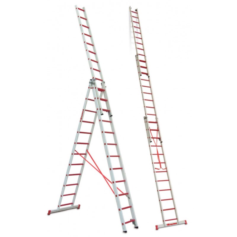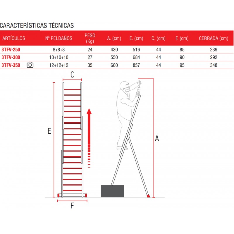 El modelo 3TFV está compuesto de 3 tramos fabricados en fibra de vidrio. El modelo puede emplearse en 2 posiciones distintas: forma extendida, los 3 tramos se acoplan entre sí, y forma auto- estable, 2 tramos en posición de tijera y un tramo deslizando sobre uno de éstos. Además, está equipado con una base estabilizadora con tacos de goma antideslizantes y adherentes a la superficie del suelo. Los tramos no pueden emplearse por separado según normativa. Este modelo es ideal para trabajos con riesgos eléctricos.