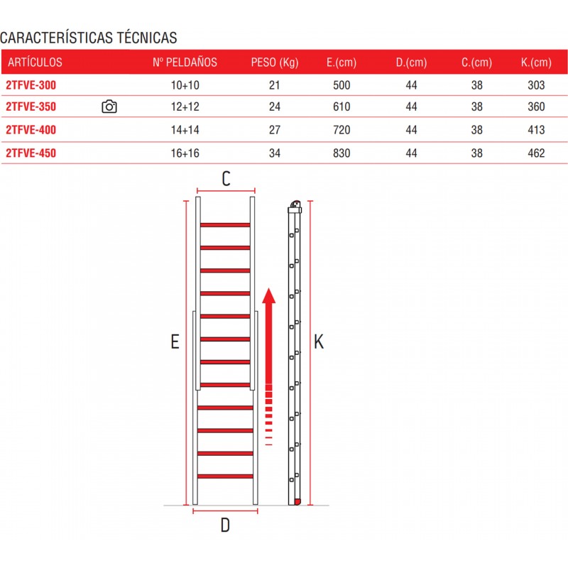 | ARTÍCULO | Nº PELDAÑOS | PESO(Kg) | E. (Cm) | D.(Cm) | C. (Cm) | K. (Cm) |