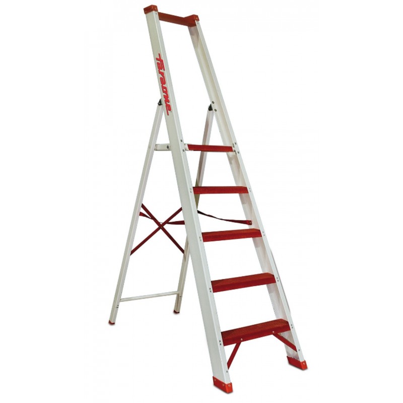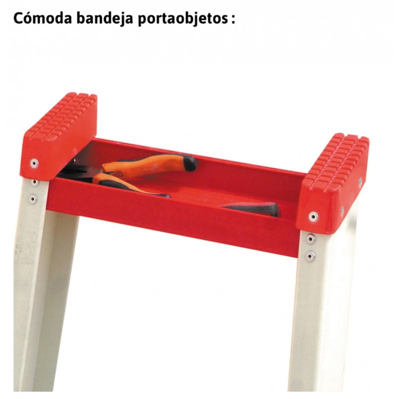 El modelo PAF es un escalera en tijera de fibra de vidrio, con peldaños antideslizantes de 8 cm y equipado con una cómoda bandeja portaobjetos. Es ideal para trabajos eléctricos y está disponible en varias alturas.