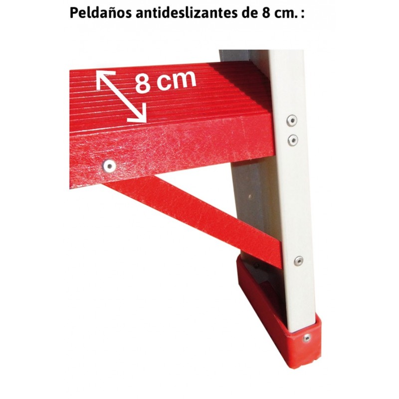 El modelo PAF es un escalera en tijera de fibra de vidrio, con peldaños antideslizantes de 8 cm y equipado con una cómoda bandeja portaobjetos. Es ideal para trabajos eléctricos y está disponible en varias alturas.