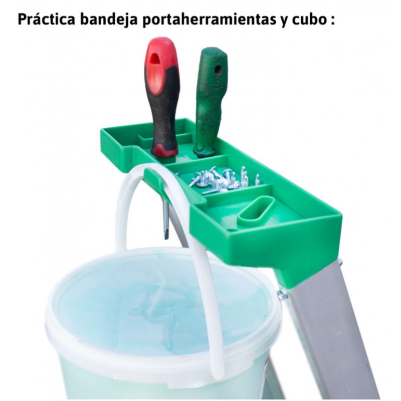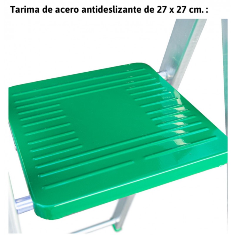 El modelo ES.DOM está fabricado en aluminio, con montantes de 50X20, peldaños de 80 mm fijados con remaches de acero de gran resistencia, posee un sistema de refuerzos en zonas vulnerables que dotan al modelo de una gran estabilidad, tarima antideslizante de 270x270 mm y una amplia bandeja portaobjetos. Este producto cumple con la normativa europea EN 131 y se entrega junto con el certificado de conformidad y el manual de instrucciones, la carga máxima que aguanta es de 150 kg.