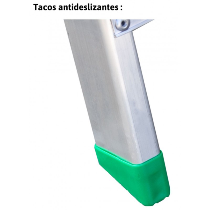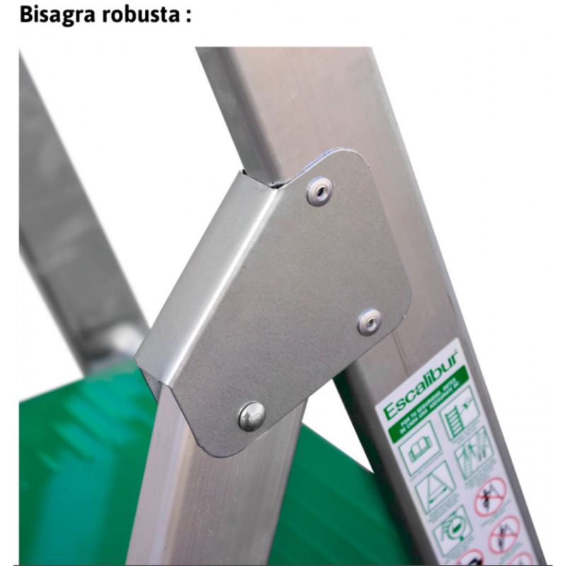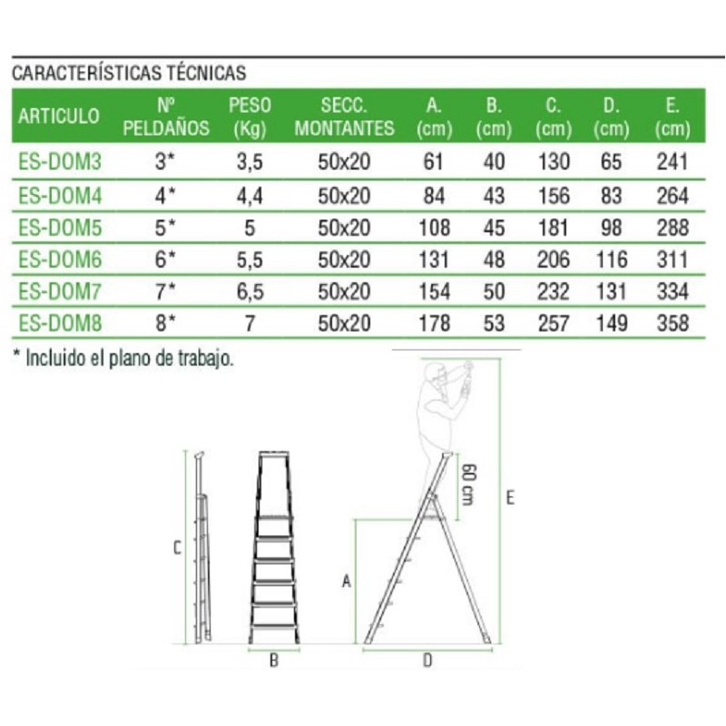 El modelo ES.DOM está fabricado en aluminio, con montantes de 50X20, peldaños de 80 mm fijados con remaches de acero de gran resistencia, posee un sistema de refuerzos en zonas vulnerables que dotan al modelo de una gran estabilidad, tarima antideslizante de 270x270 mm y una amplia bandeja portaobjetos. Este producto cumple con la normativa europea EN 131 y se entrega junto con el certificado de conformidad y el manual de instrucciones, la carga máxima que aguanta es de 150 kg.